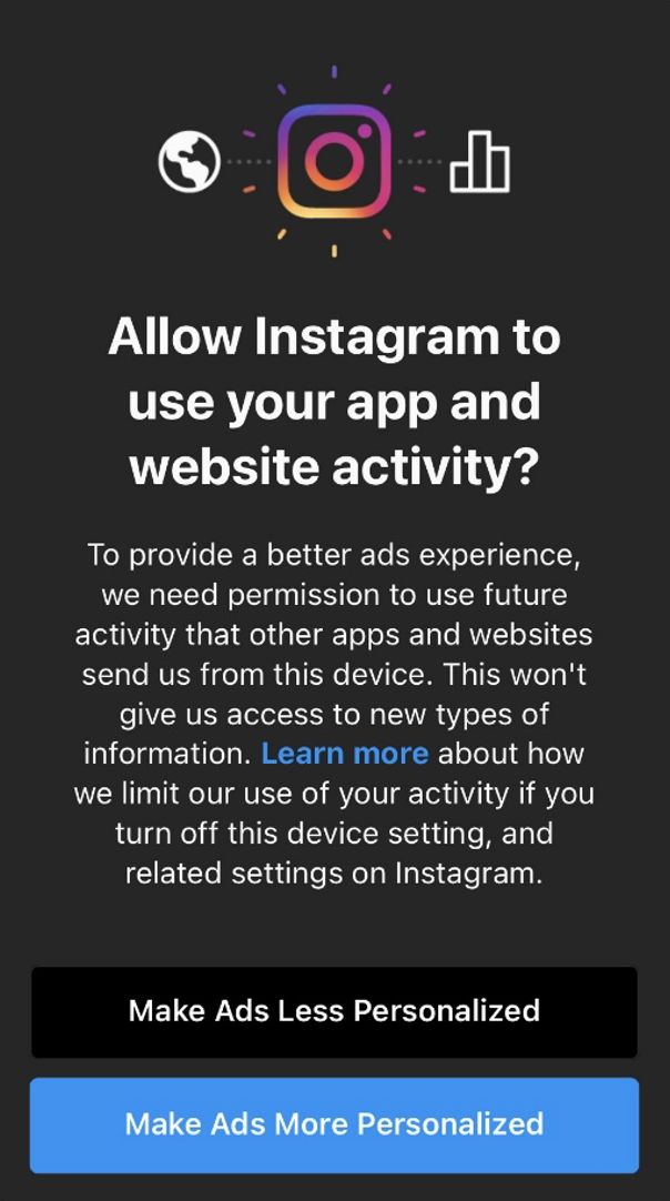 In her analysis, she also provided the example of application pop-ups [such as Instagram’s pop-ups] that request permission from users to create a ‘more personalised experience’ by tracking cross-device activity. This design language, while framed as a user benefit, serves to mask a broad data-tracking mechanism [tracking and targeting a user’s activity across their device] that extends beyond the user’s immediate intent.